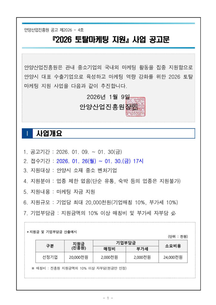 지난 1월 30일, 안양산업진흥원이 주관하는 ‘2026년 토탈마케팅 지원사업’ 접수가 마감되었습니다. 안양시 관내 중소기업의 마케팅 역량 강화를 위해 기업당 최대 2,000만 원을 지원하는 대규모 사업인데요.